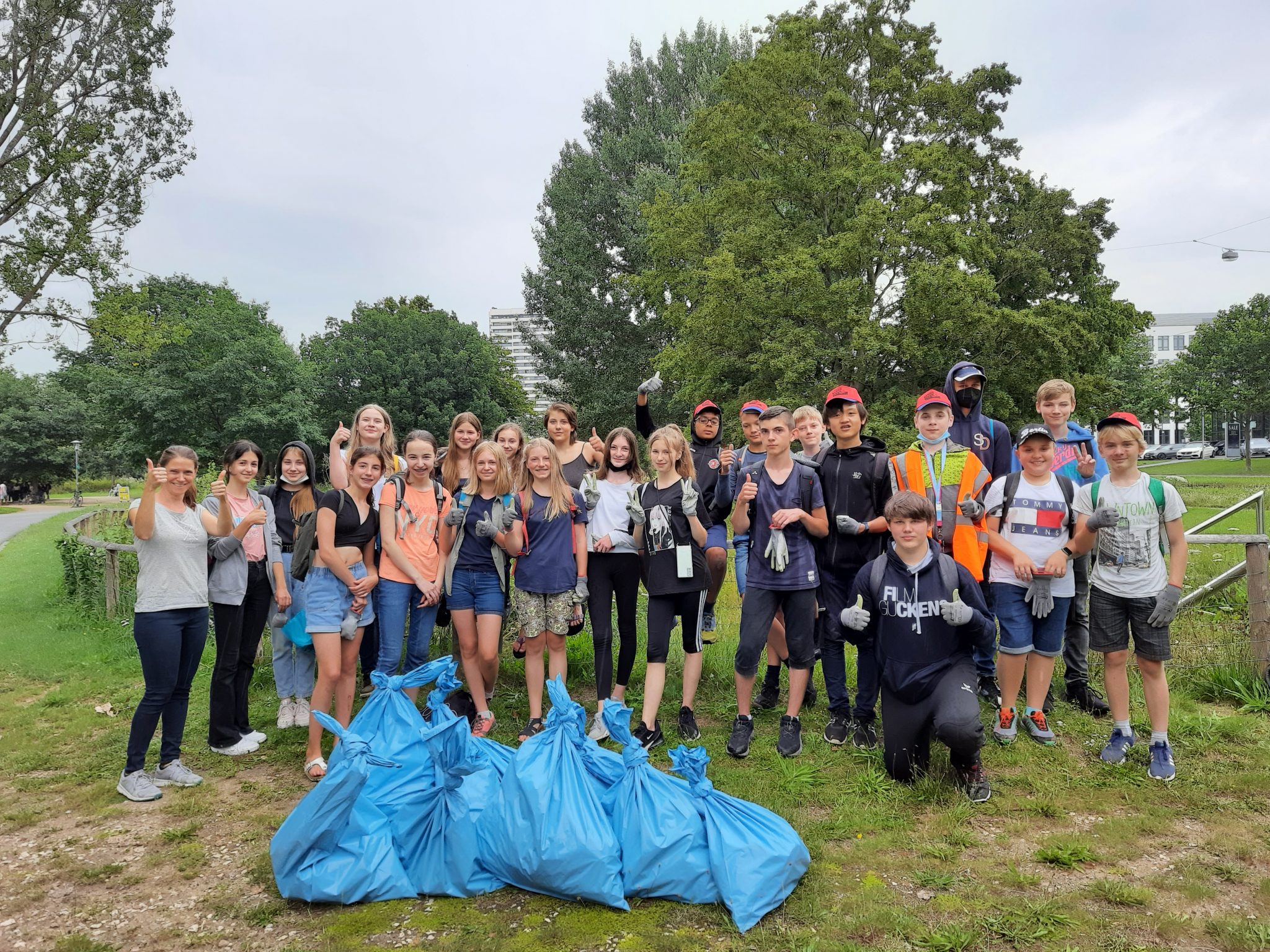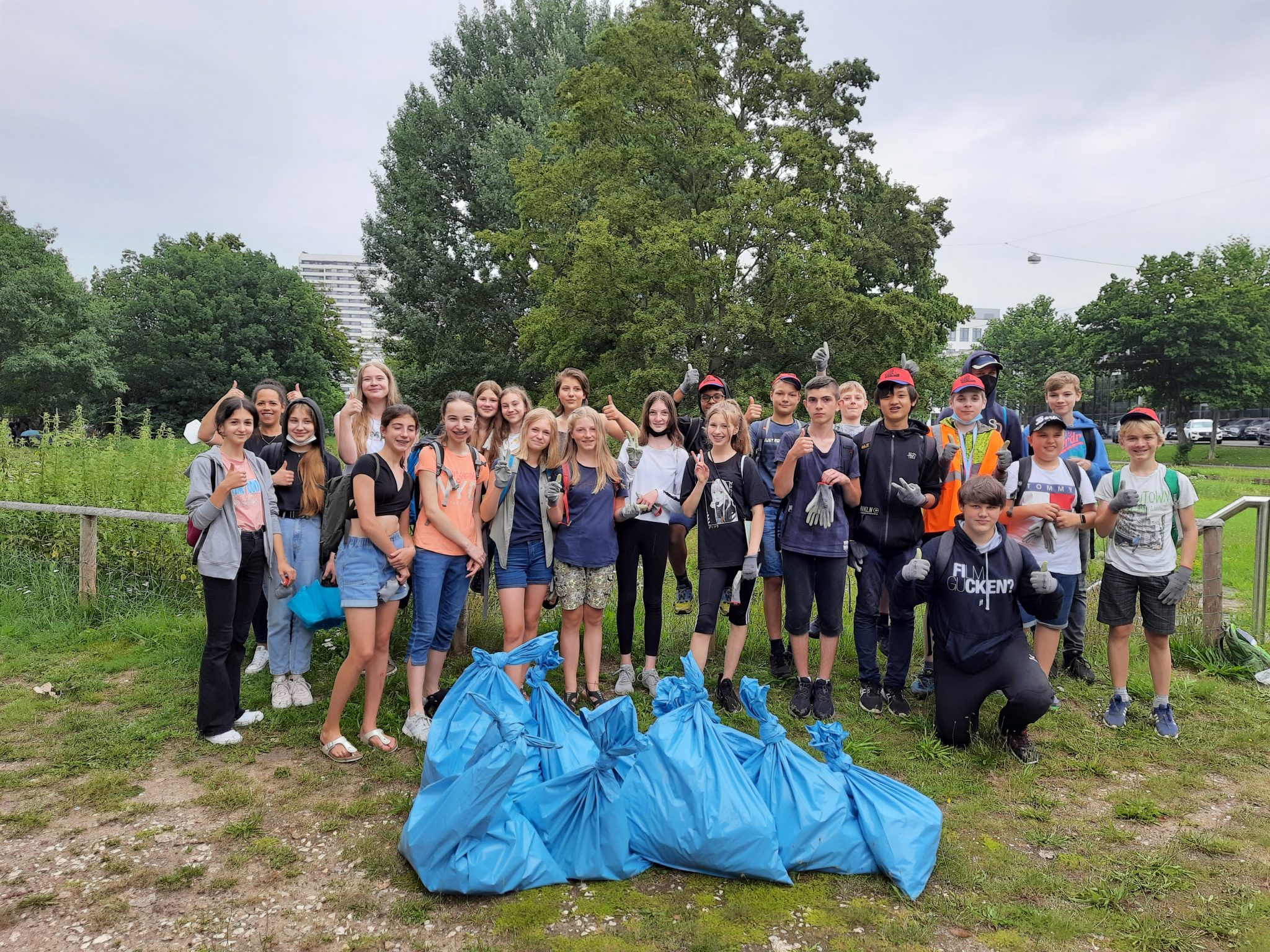 Wie Plastik ins Meer gelangt – so fing alles an im Geographieunterricht bei Frau Böh. Über Flüsse wird der Müll von Wiesen, Wegen, Stränden und Uferflächen durch den Regen ins Meer gespült und dann bleibt er dort für Jahre, Jahrzehnte oder Jahrhunderte. Die Klasse 7g des Sigmund-Schuckert-Gymnasiums ließ das Müllproblem nicht mehr los, denn viele Schüler*innen haben auch bereits in ihrer Umgebung festgestellt: Viele Menschen hinterlassen ihren Müll oder werfen diesen nicht in den Mülleimer. Also beschlossen wir, gemeinsam aktiv zu werden und für ein paar Stunden eine öffentliche Grünanlage von Müll zu befreien. Im Rahmen der Aktion „Kehrd wärd“ der SöR (Service öffentlicher Raum) der Stadt Nürnberg kein Problem, denn diese stellt Freiwilligen Handschuhe, Müllsäcke und Warnwesten zur Verfügung und holt abschließend die vollen Müllsäcke an einer vereinbarten Stelle ab. Am Montag, den 26.7., war es dann soweit: Die Klasse 7g sammelte in Begleitung von Frau Hartrumpf und Frau Böh fleißig jeden Schnipsel Müll am Wöhrder See ein. Die Säcke füllten sich schnell, denn nicht nur unzählige Zigarettenstummel, sondern auch Fast-Food-Verpackungen und Flaschen fanden wir zuhauf. Nach ca. zwei Stunden waren die Müllsäcke gut gefüllt und wir gingen mit einem guten Gefühl nach Hause, aktiv etwas für den Umweltschutz getan zu haben! Und alle waren sich das einig: Das sollte man viel öfter tun!