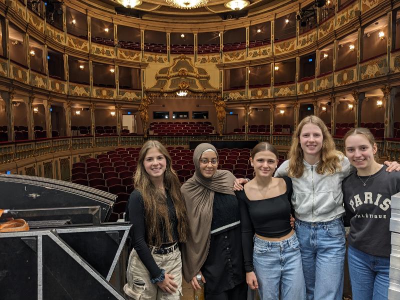 Im Anschluss konnten die Schülerinnen und Schüler im Gespräch mit der Schauspielerin persönliche Einblicke in das Theaterhandwerk gewinnen. Außerdem durften sie am Ende des Vormittages noch einen Blick „hinter die Kulissen“ des Markgrafentheaters werfen und dabei selbst auf der großen Bühne stehen, wo gerade die Kulissen für die Abendvorstellung aufgebaut wurden. Insgesamt war es ein sehr gelungener Ausflug für alle Beteiligten!
