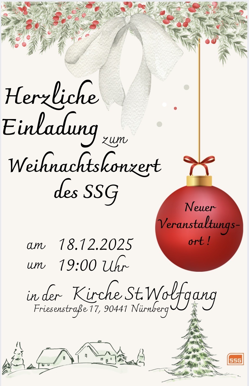 Herzliche Einladung zum diesjährigen Weihnachtskonzert. Bitte beachten Sie den neuen Veranstaltungsort. Das Konzert findet in diesem Jahr erstmals in der Kirche St. Wolfgang (Friesenstraße 17, 90441 Nürnberg) statt. Die Kirche liegt in einem Wohngebiet mit sehr begrenzten Parkmöglichkeiten. Bitte nutzen Sie deshalb die öffentlichen Verkehrsmittel, um zum Konzert zu kommen. Die Kirche ist gut erreichbar über die S2 (Haltestelle Sandreuth), bzw. über die Haltestelle „Hohe Marter“ der U2.